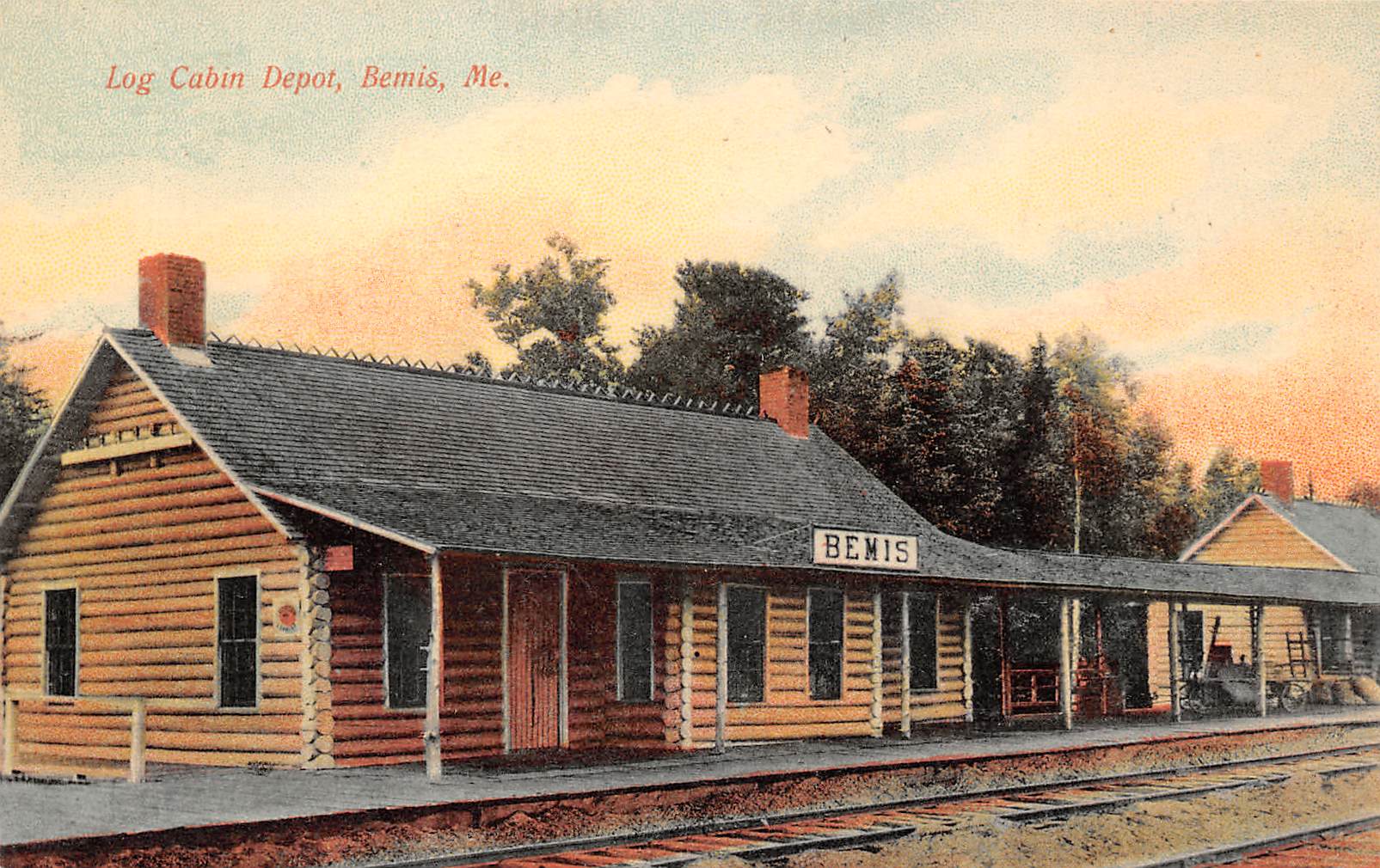 Bemis Maine Log Cabin Depot, Color Lithograph Vintage Postcard U11759