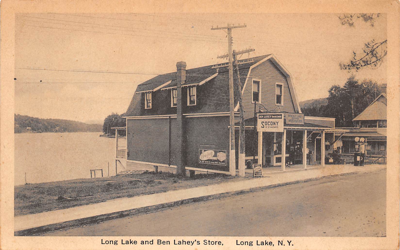 Long Lake New York Long Lake & Ben Lahey’s Store, Socony Gas Sign & Pumps, PC U11767