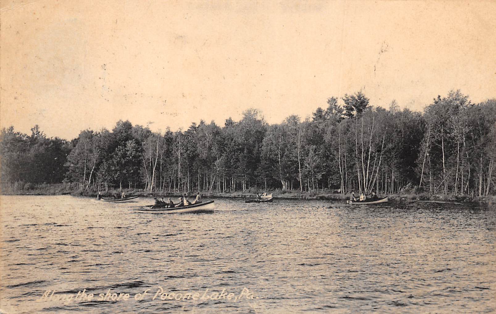 Pocono Lake Pennsylvania Along The Shore, B/W Lithograph Vintage Postcard U12291