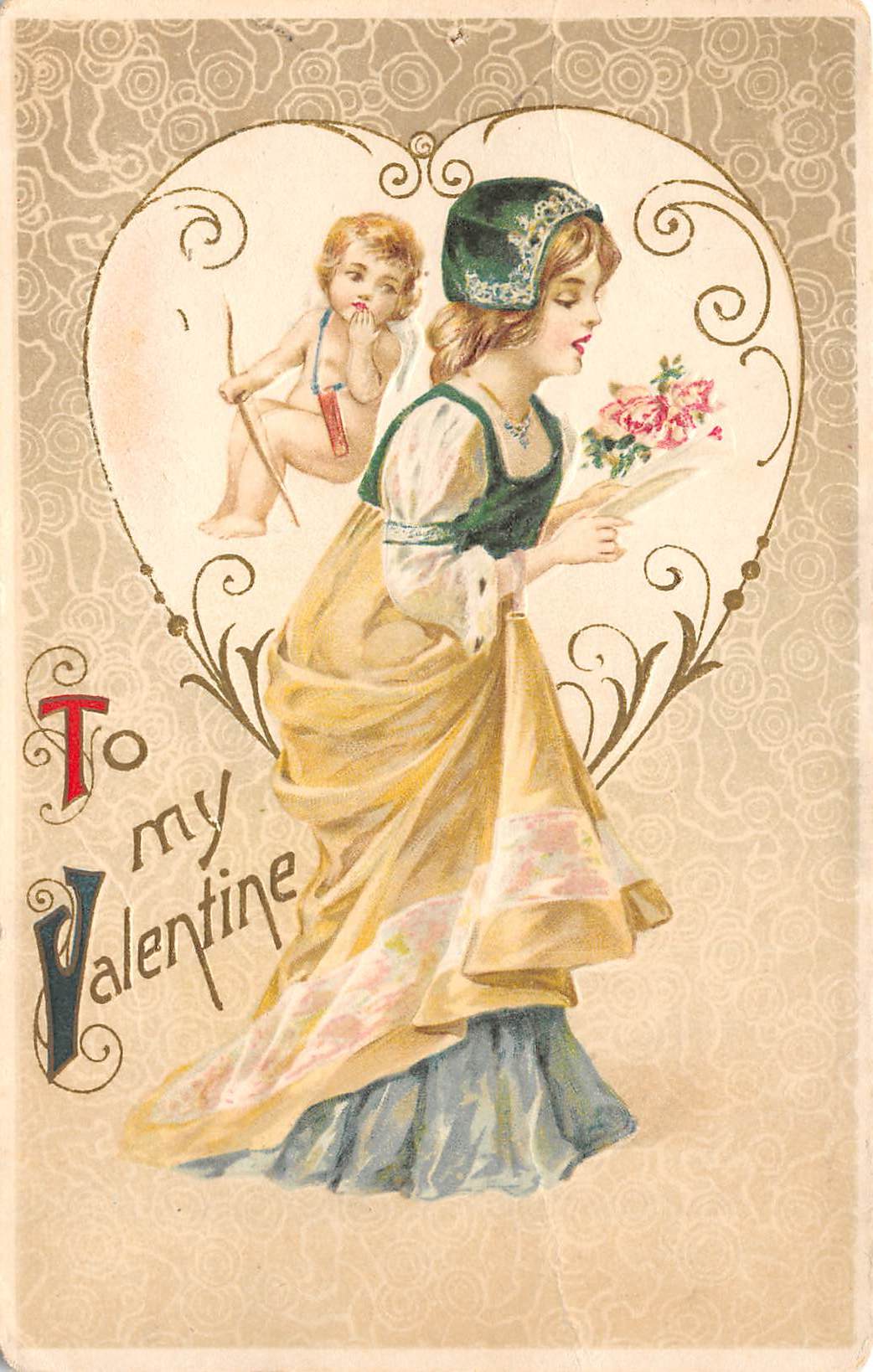 “To My Valentine”, Winsch Pretty Lady At Cupid Fountain, Vintage PC U22121